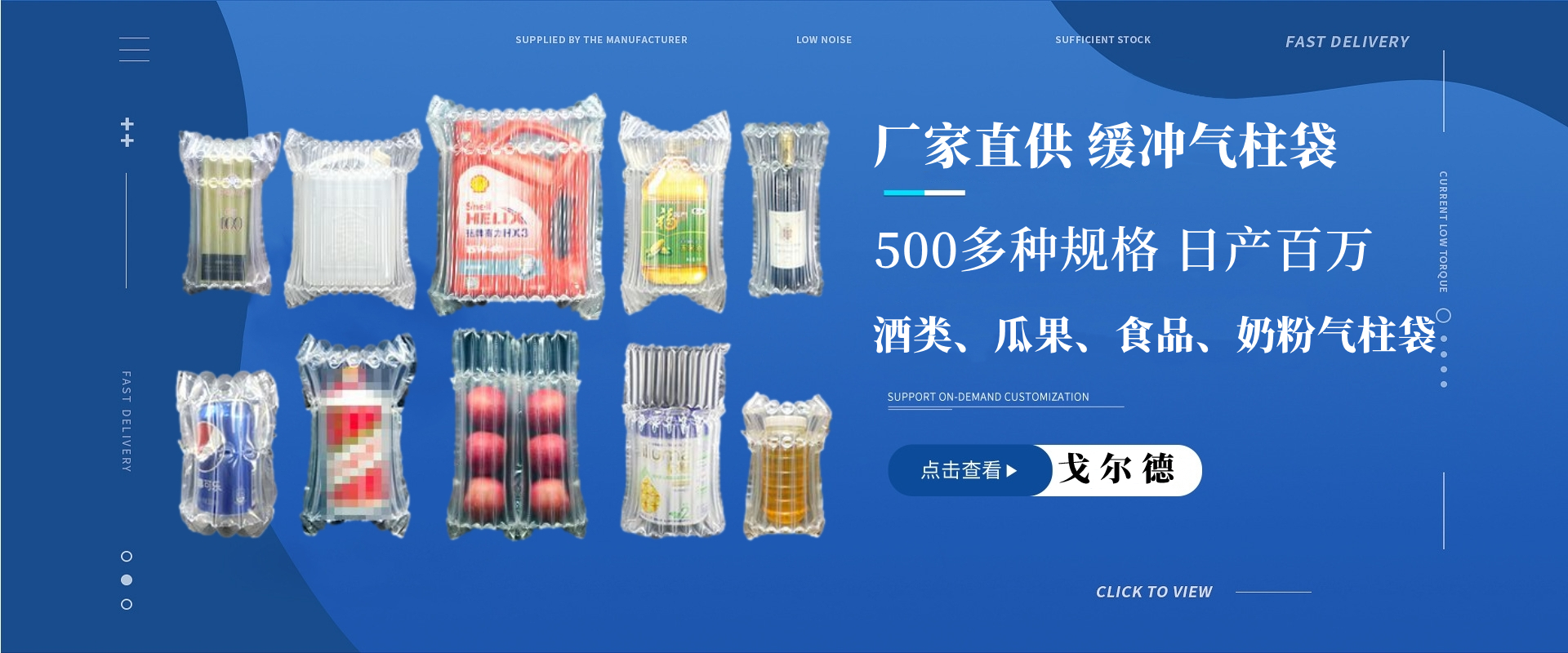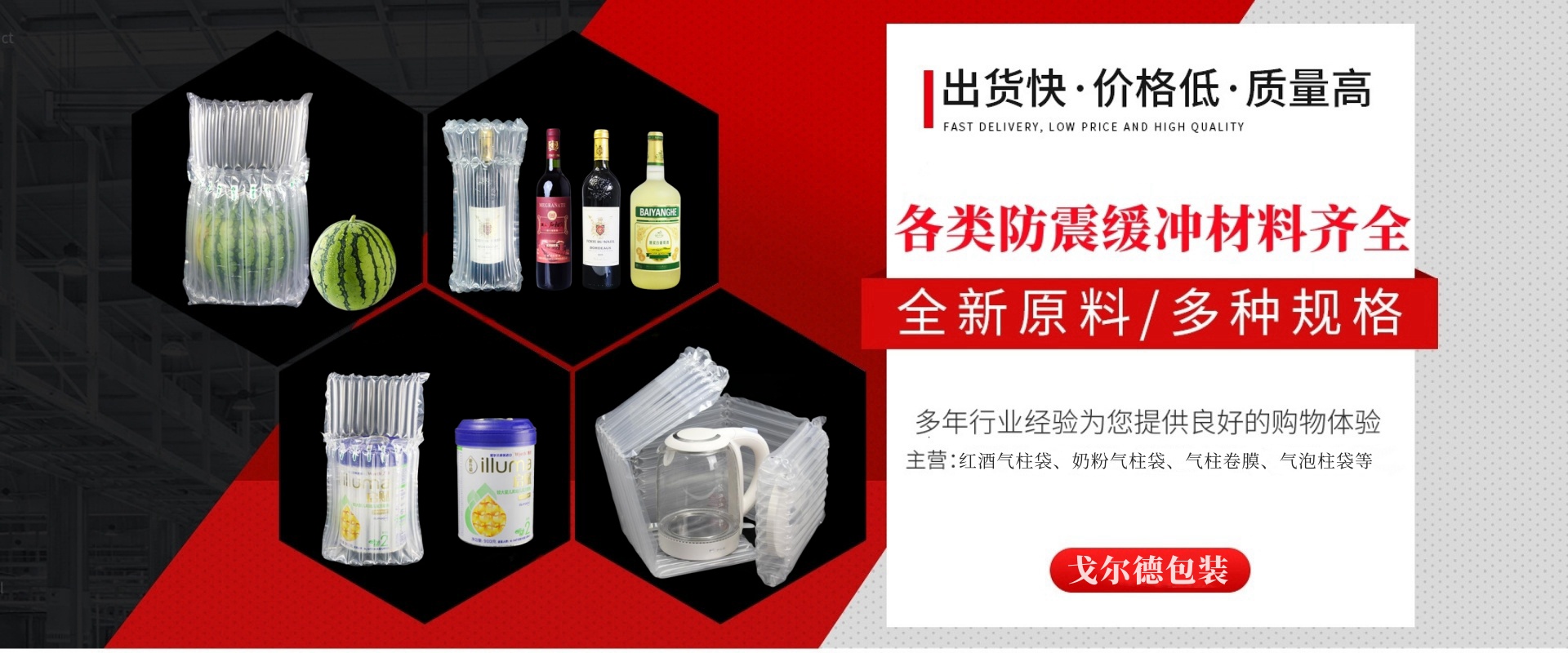 昆山戈尔德包装科技有限公司是红酒气柱袋、硒鼓气柱袋、奶粉气柱袋、气柱卷膜、气泡柱袋等产品专业生产加工的公司,拥有完整、科学的质量管理体系,昆山戈尔德包装科技有限公司是一家集研发、设计、生产、销售、服务于一体的实体企业。我们运用包装防震技术为商品流通提供了好的保护,同时降低了用户的单位成本并符合绿色环保。我们生产的气柱袋广泛运用于电商运输、化妆品、奶粉、酒水饮料、微电子产品、精密仪器、医疗器械、家用电器、数码产品,以及其它易碎商品的内层保护性包装。 环保充气包装是一种新型的包装产品,是目前好的缓冲、抗震、填充包装材料,利用自然的空气包装技术,既节约能源、降低成本,为商品流通领域提供了安全的保护,并能极大地降低企业的包装成本。